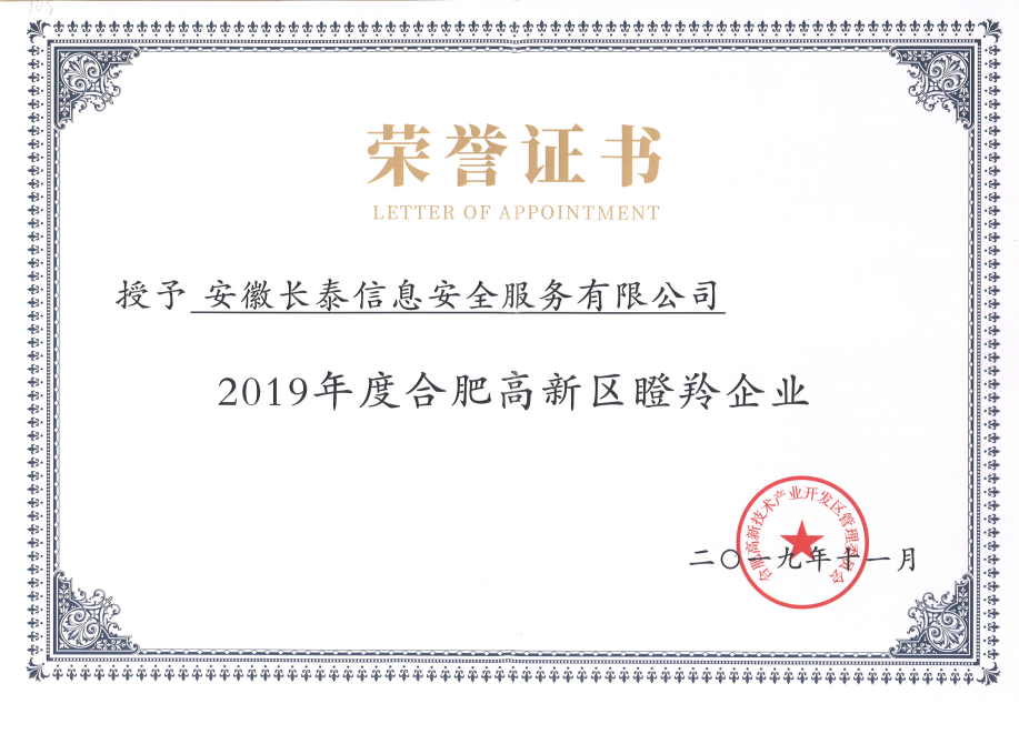 2019年,11月20日,合肥高新区2019年高成长企业榜单正式发布,高新区共认定了502家高成长企业,其中雏鹰企业275家、瞪羚培育企业72家、瞪羚企业149家、潜在独角兽企业3家、独角兽企业1家、平台型龙头企业2家。作为其中的高科技企业——安徽永利在线登录官网-永利(中国)成功入选瞪羚企业榜单。